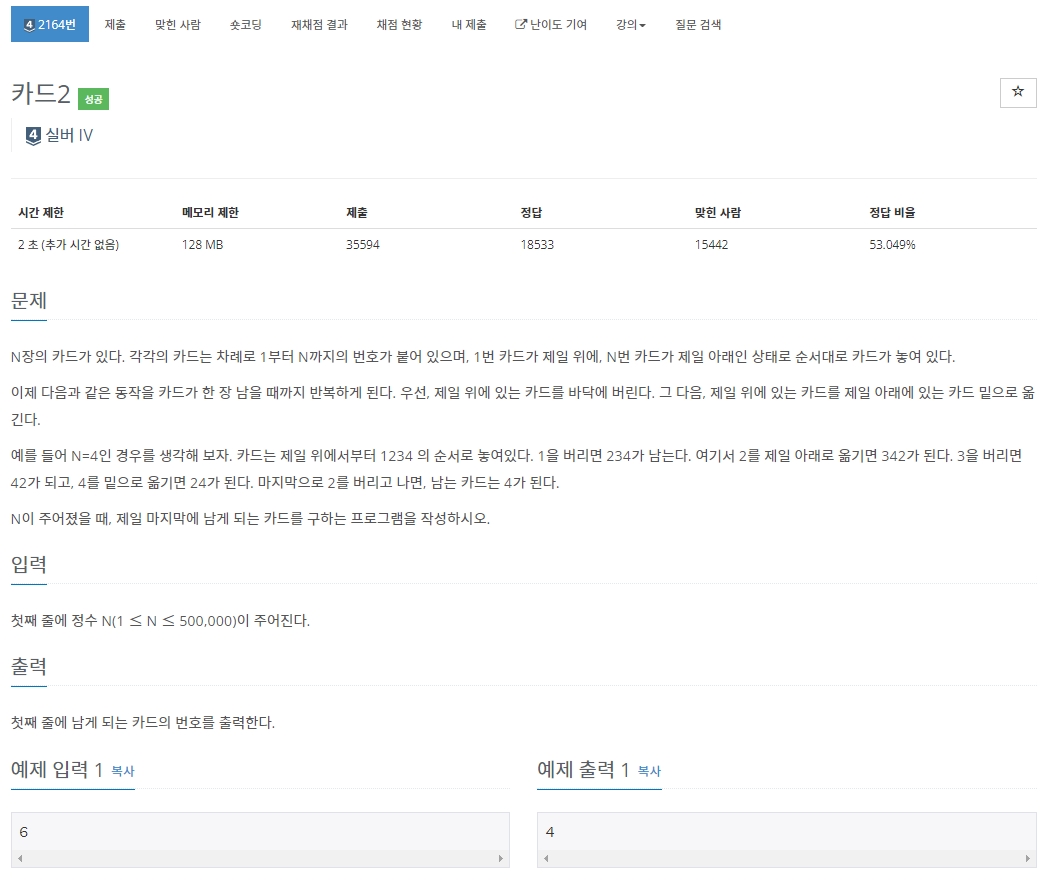 을 반복하다가 1개가 남았을때의 카드가 뭔지 구하는 문제이다. 덱으로 해결하려다가, 생각해보니 큐만 써도 해결될 것 같아 큐로 해결하였다. 덱으로도 해결가능하다.