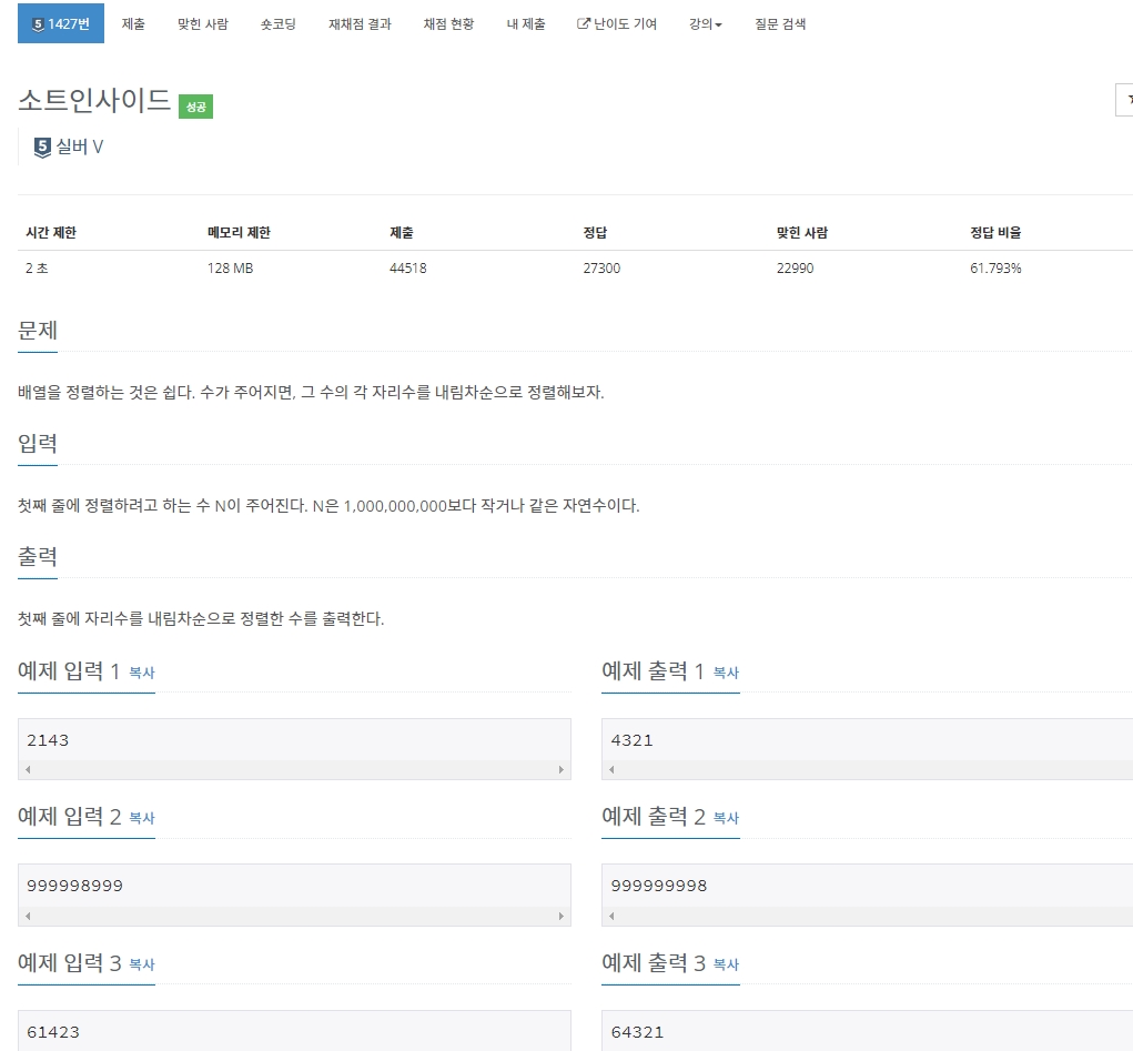 https://www.acmicpc.net/problem/1427