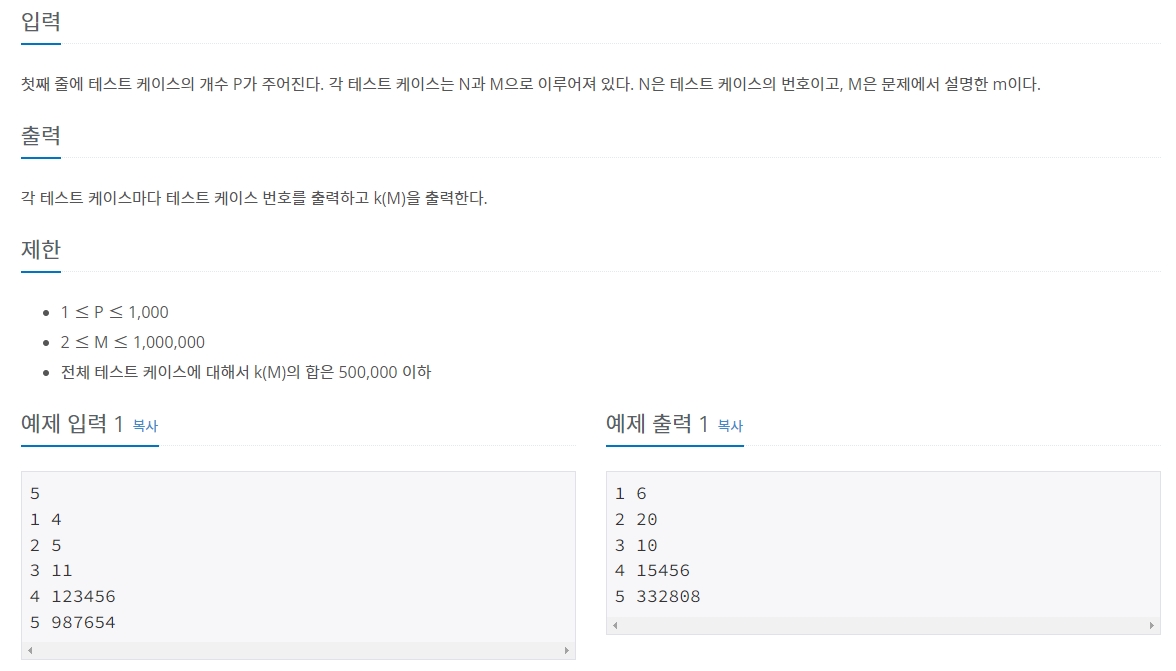 첫째 줄에 테스트 케이스의 개수 P가 주어진다. 각 테스트 케이스는 N과 M으로 이루어져 있다. N은 테스트 케이스의 번호이고, M은 문제에서 설명한 m이다.