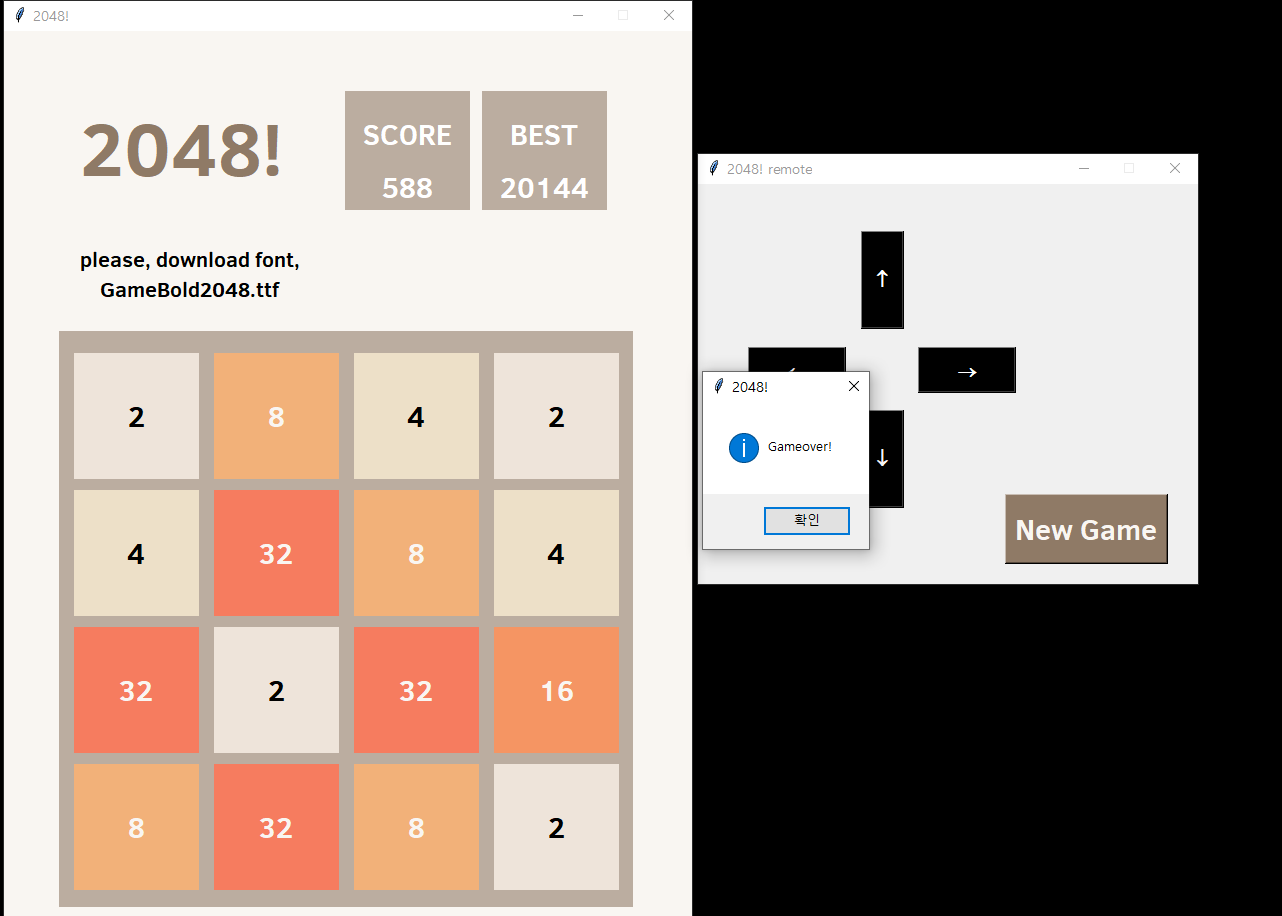 그리고 pc게임인 만큼 wasd키와 방향키를 통해 움직이게 하고 싶었지만, 이러한 테크닉은 학교에서 가르친 범위 바깥이었기 때문에 키보드로 진행하게 하는 방식을 중간에 버리고, 키보드가 아닌 상하좌우 키를 표시한 또다른 tkinter 창을 띄워서 움직이게 했다. 하지만 키보드로 하는게 훨씬 좋은 것 같긴 하다.