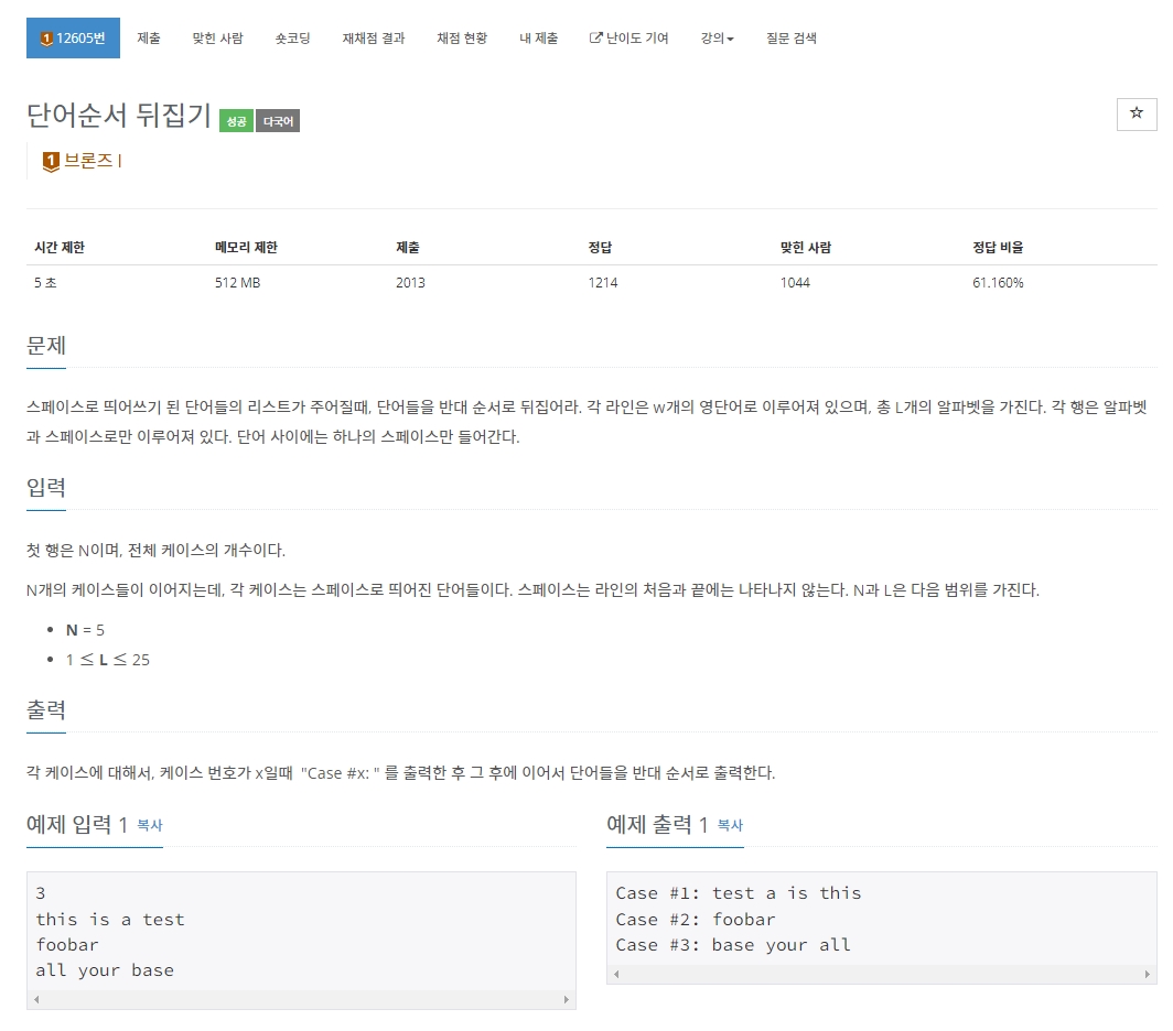 스페이스로 띄어쓰기 된 단어들의 리스트가 주어질때, 단어들을 반대 순서로 뒤집어라. 각 라인은 w개의 영단어로 이루어져 있으며, 총 L개의 알파벳을 가진다. 각 행은 알파벳과 스페이스로만