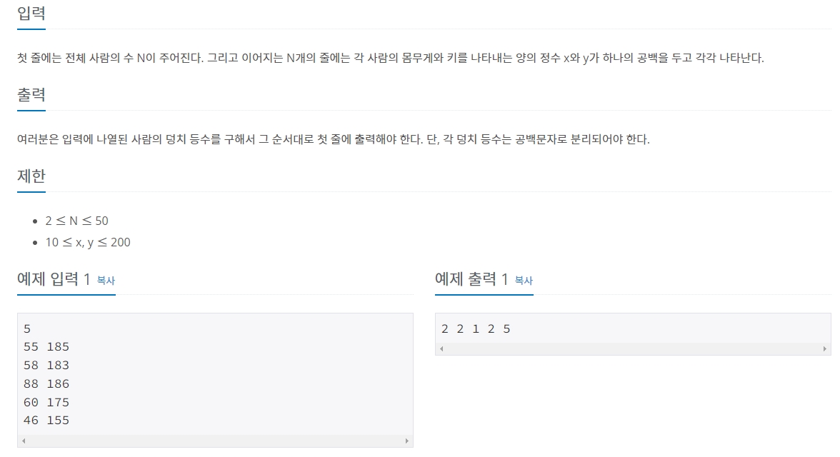 덩치를 구하는 문제. 자신을 제외한 모든 사람들과 비교해야 하기 때문에 브루트 포스로 접근한다.