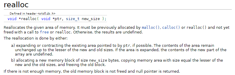 여기서 질문이 생겼다. realloc은 인자로 입력받은 포인터와, 재할당한 후에 반환하는 포인터가 같음을 보장하지 않는다. 즉, 입력받은 포인터와 반환받은 포인터가 다를 수 있다. 그러면 이전에 존재하는 데이터는 어떻게 되는지가 궁금했다. 이러한 질문을 해결하기 위해 구글링을 하다가, 왠지 공식문서에 나와있을 것 같았다. 그렇게 공식문서에 들어가서 알아보았다. 그리고 realloc에 관한 문서를 찾았다.