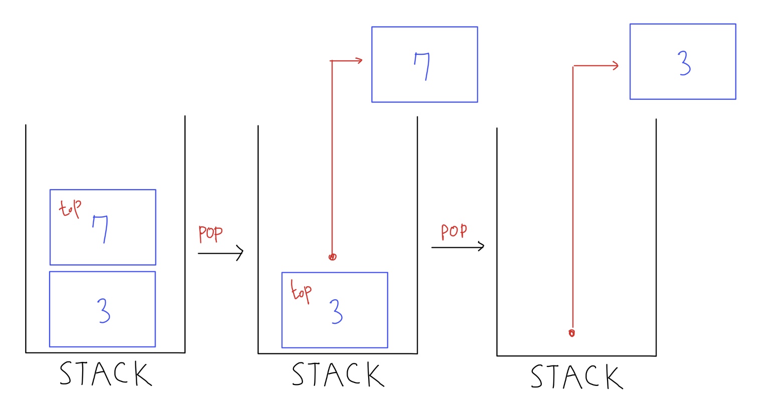 LIFO구조이기 때문에, 책을 쌓는 것처럼 3과 7이 들어온다. 3이 들어왔을 때는, 3이 제일 위에 있기 때문에(3밖에 없으니까) 3이 top이 된다. 이후 7이 들어오면서, 7이 top이 되고, 이후 pop을 수행한다면 7이 제일 먼저 내보내질 것이다.