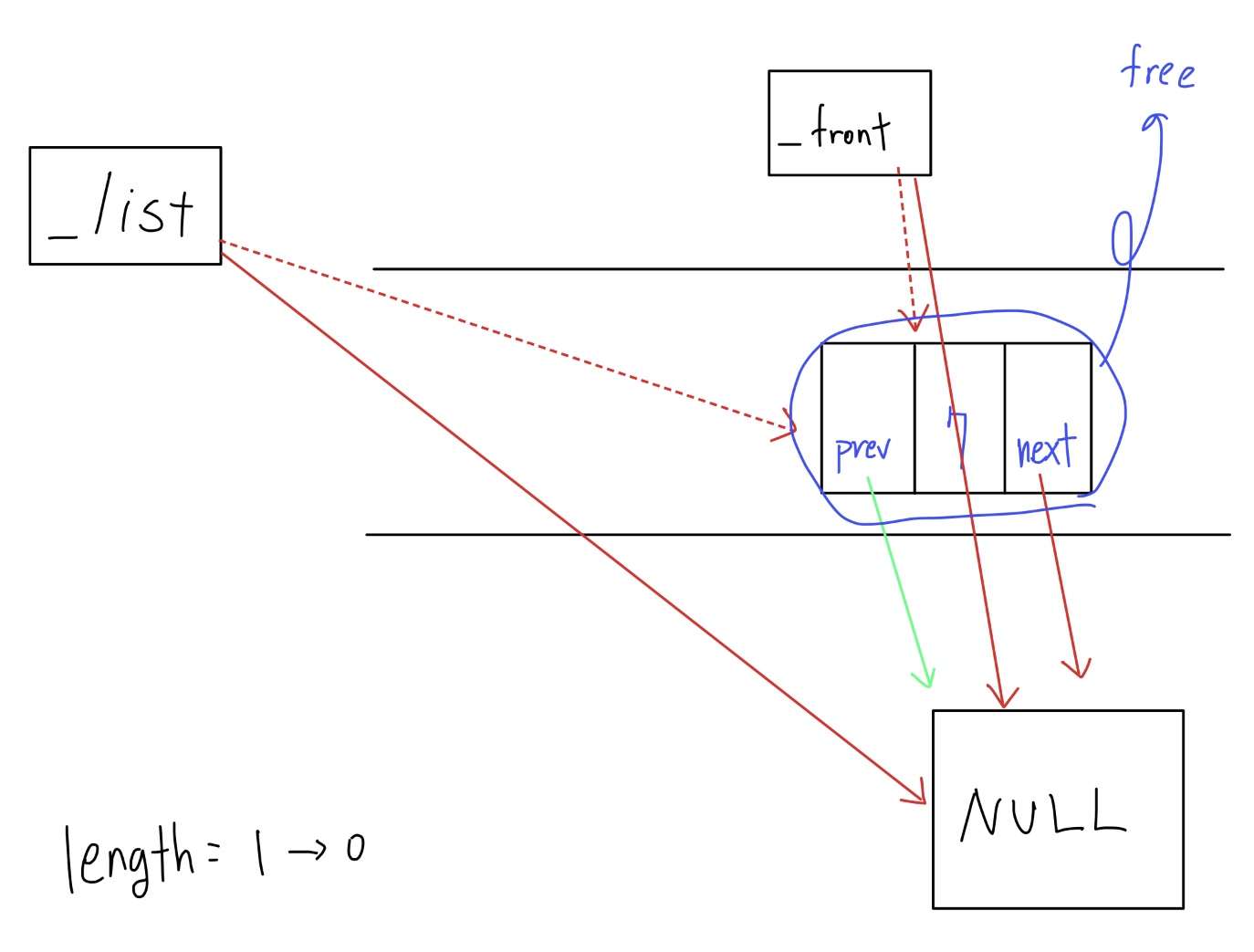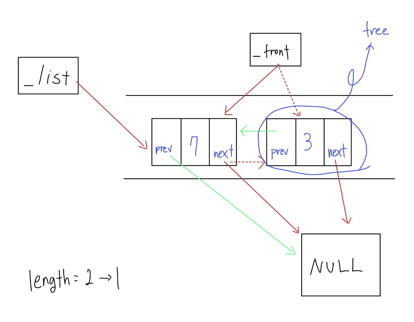 일단 _front가 가리키는 노드를 없애야 하기 때문에 _front노드가 가르키는 노드의 _prev를 통해 이전 노드를 가리키도록 한다. 이렇게 가리키게 된 front노드는 맨 끝 노드가 되어버렸으므로 _next가 NULL을 가르키도록 한다. 그리고 길이를 줄인 후에 할당을 해제 한다.