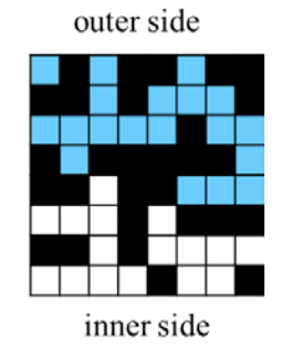 인제대학교 생화학연구실에 재직중인 석교수는 전류가 침투(percolate) 할 수 있는 섬유 물질을 개발하고 있다. 이 섬유 물질은 2차원 M × N 격자로 표현될 수 있다. 편의상 2차원 격자의 위쪽을 바깥쪽(outer side), 아래쪽을 안쪽(inner side)라고 생각하기로 한다. 또한 각 격자는 검은색 아니면 흰색인데, 검은색은 전류를 차단하는 물질임을 뜻하고 흰색은 전류가 통할 수 있는 물질임을 뜻한다. 전류는 섬유 물질의 가장 바깥쪽 흰색 격자들에 공급되고, 이후에는 상하좌우로 인접한 흰색 격자들로 전달될 수 있다.