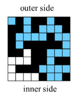 인제대학교 생화학연구실에 재직중인 석교수는 전류가 침투(percolate) 할 수 있는 섬유 물질을 개발하고 있다. 이 섬유 물질은 2차원 M × N 격자로 표현될 수 있다. 편의상 2차원 격자의 위쪽을 바깥쪽(outer side), 아래쪽을 안쪽(inner side)라고 생각하기로 한다. 또한 각 격자는 검은색 아니면 흰색인데, 검은색은 전류를 차단하는 물질임을 뜻하고 흰색은 전류가 통할 수 있는 물질임을 뜻한다. 전류는 섬유 물질의 가장 바깥쪽 흰색 격자들에 공급되고, 이후에는 상하좌우로 인접한 흰색 격자들로 전달될 수 있다.