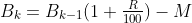 소수점 두자리까지 입력으로 들어오기에 우리는 입력으로 들어오는 R,B,M에 100을 곱하여 자연수로 변환한다. 여기까진 별 문제가 없으나, 이자율 R에도 100을 곱해야하며, 그 이후의 소수점에도 반올림을 적용해야한다. R,B,M에 100을 곱해 소수점을 없앤 값을 r,b,m이라 하고, 문제 조건의 소수점 센트를 안보기 위해선 식을 다음과 같이 바꿀 수 있다.