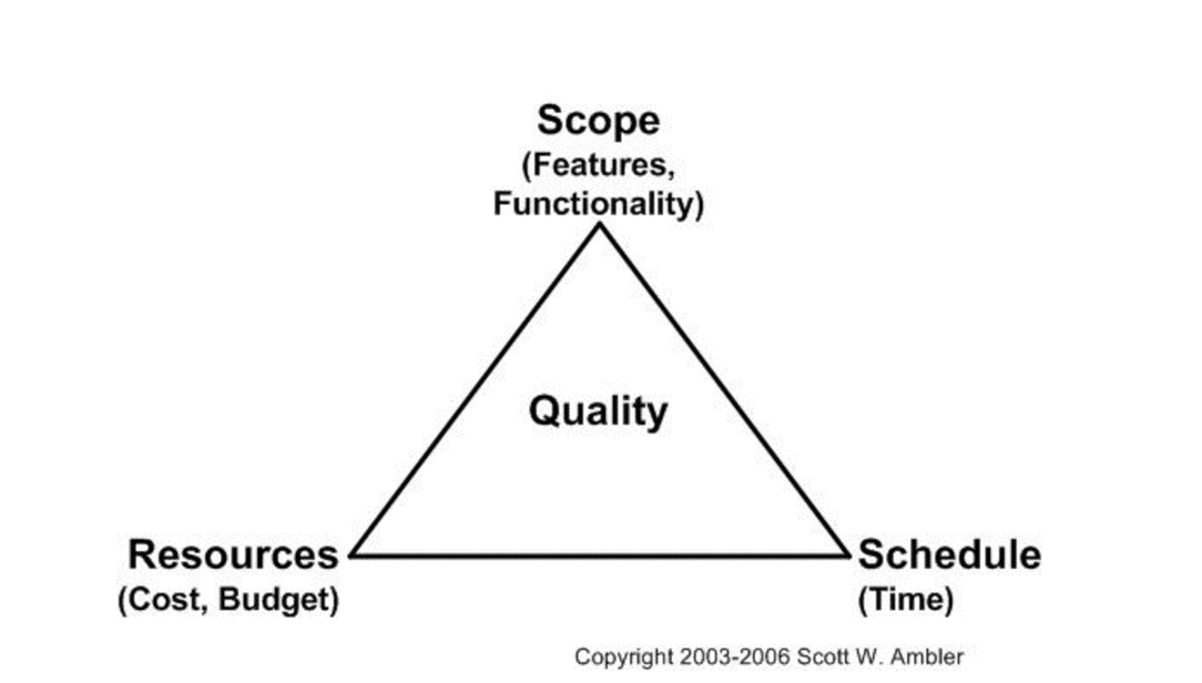 Scope(할 일), Resources, Scedule 이 셋이 긴밀한 관계를 맺고 있으며 이 셋은 소프트웨어의 품질에 영향을 미친다는 뜻이다.