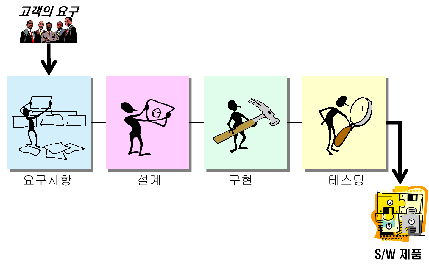 - 하나의 개발과정이 끝나야만 다음 과정으로 넘어갈 수 있다. → 선형적