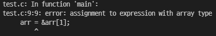 이를 통해 포인터의 이름은 배열의 첫번째값의 주소와 같다는 것을 알 수 있다. 하지만 배열은 상수형 포인터라고 했다. 즉, 배열의 선언을 통해 메모리의 주소값이 주어지지만, 이를 바꿀 수는 없다는 것이다.