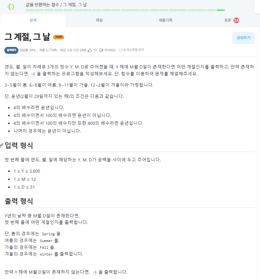 윤년을 구분하는 문제는 유명하기도 하고, 해당 테스트 문제를 풀기 전에, 윤년을 구분하는 문제가 있기 때문에, 그 문제에서 작성한 함수를 가져와서 풀었다. 윤년일땐 2월의 일수를 늘려주면 된다.
