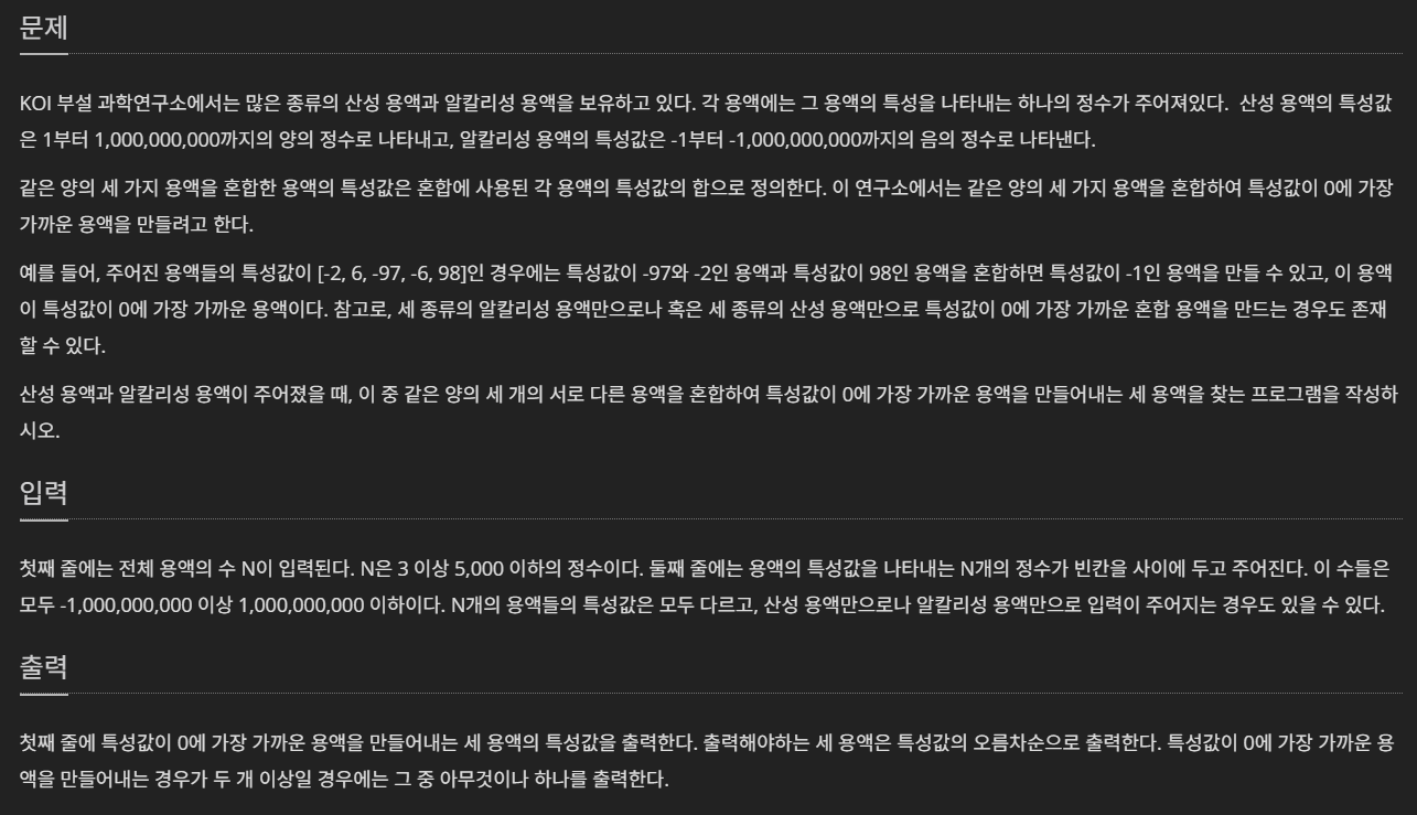 용액이 세개로 늘어났다고 해서 쫄 필요가 없다. 이 문제도 투포인터로 풀이가 가능하다. 이 문제를 브루트포스로 푼다면 O(N^3)이 나올 것이다. 5000^3은 1250억이다. 당연히 안될 것이다. 하지만 해당 문제를 투포인터로 풀게 되면 O(N^2)이 된다. 투포인터의 시간복잡도는 O(N)이지만, 반복문을 통해 하나의 용액을 결정하고, 이후 투포인터를 돌려가며 세 특성값의 합이 0에 근접하는 값을 찾으면 된다.