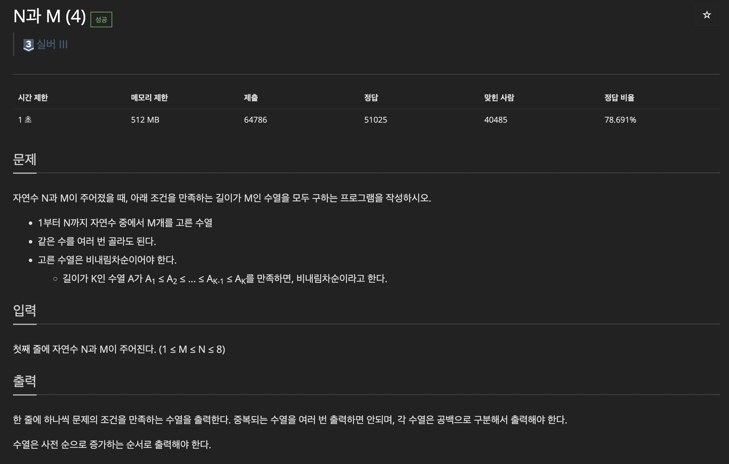 역시 백트래킹 문제이다. 다만 이전에 풀었던 15650번 N과 M(2)과 비슷한 문제이다. 비내림차순이라는 단어가 나와서 내림차순이 아닌 상태의 수열을 출력하라는줄 알고 순간 놀랐지만, 오름차순이라는 말을 굳이 꼬아서 쓴 것이었다. 해당 문제는 중복을 허용하기 때문에 15650번과는 다르게 반복문의 범위를 이전에 선택한 값도 다시 선택할 수 있도록 했다.