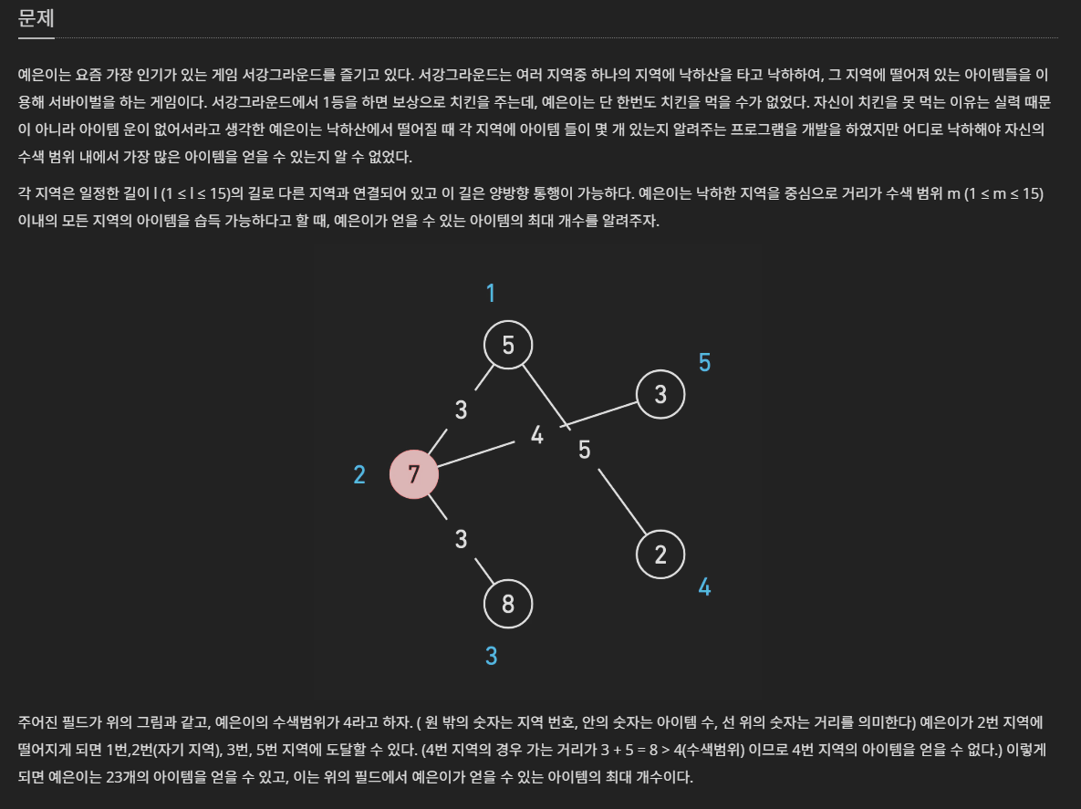 이 문제 역시 최단경로 문제이다. 다만, 특정 정점을 시작점으로 잡는 것이 아니라 임의의 정점에서 시작했을 때, 수색 범위 내에 있는 아이템의 개수의 최댓값을 구하는 문제이다. 정점의 개수도 그렇고 간선의 개수도 모두 100 이하이기 때문에 모든 정점에서 다익스트라를 돌려도 되겠으나, 정점의 개수가 적기 때문에 플로이드워셜로 한번에 최단 거리를 구한 후, 각 정점에 대해 순회하며 최댓값을 구했다.