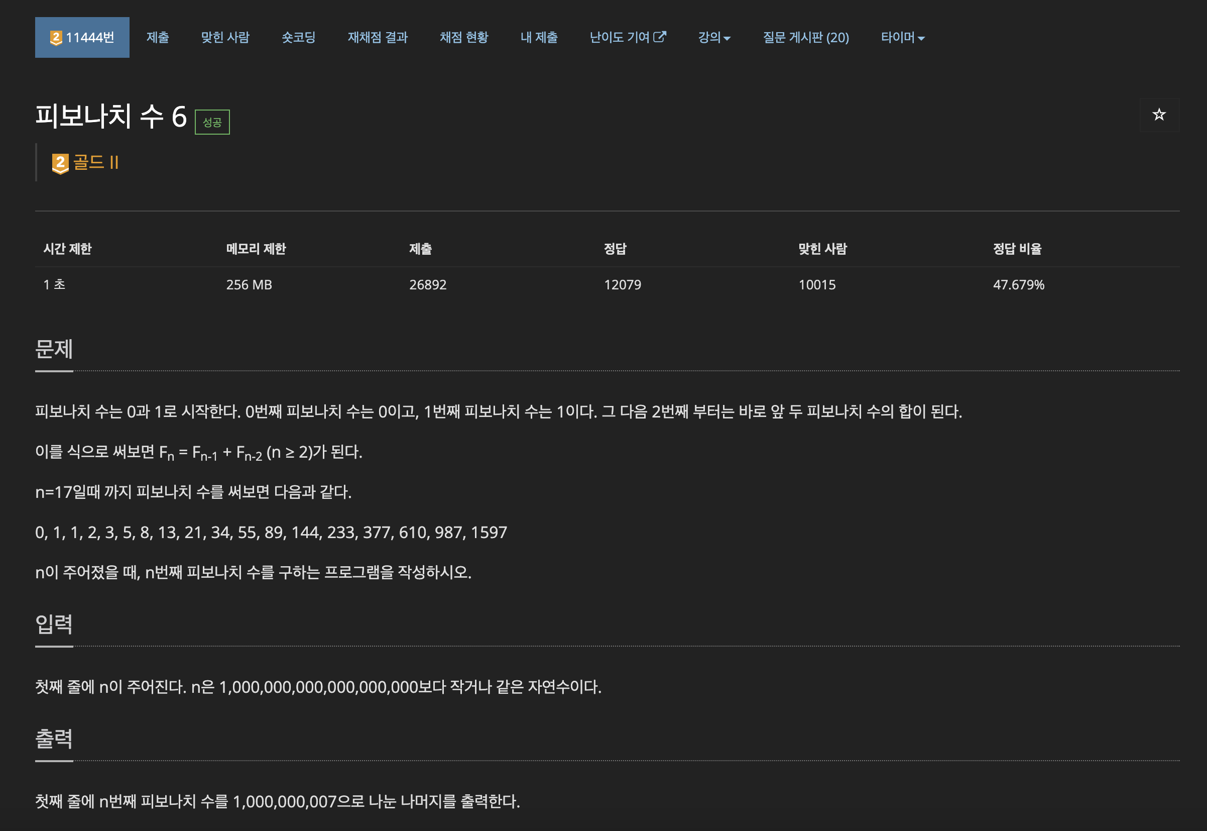피보나치 수열의 n번째 원소를 1000000007으로 나눈 나머지를 구하면 되는 아주 간단한(?) 문제이다. 단지 n이 최대 100경일 뿐이다...