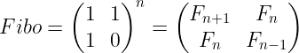 누가 봐도 O(logN)으로 줄일 필요가 있어 보인다. 피보나치 수열은 행렬로도 나타낼 수 있다고 들은 기억이 있어 해당 정보를 통해 피보나치 수열의 행렬식을 찾아보았다. 피보나치 수열의 행렬식은 다음과 같다.