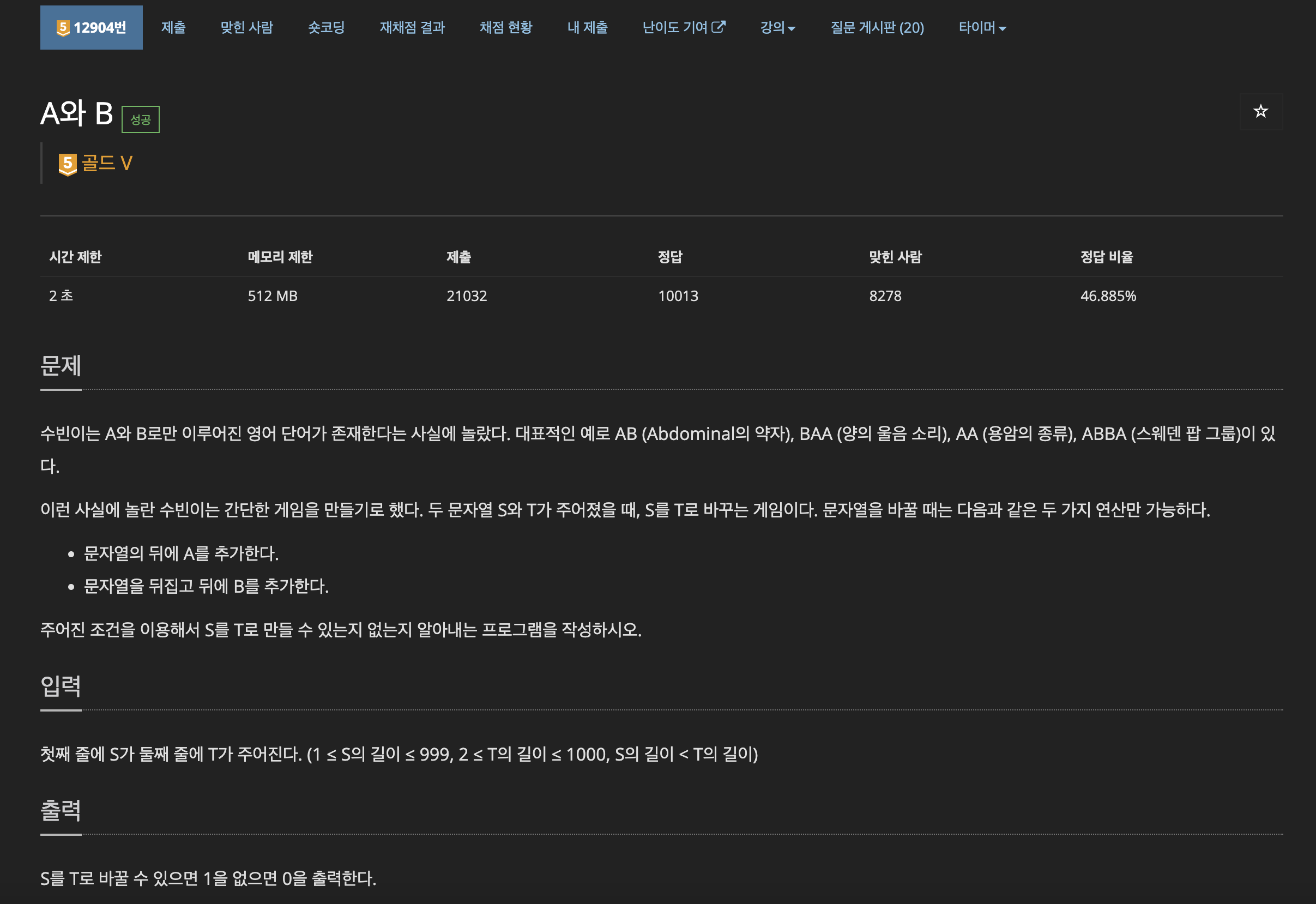 밀린문제 풀이다. 이전번에 풀이한 12919번(https://codejin.tistory.com/282) 보다 덜 복잡한 문제이다. 저번 문제는 b를 추가한 후 문자열을 뒤집었기 때문에 문자열의 맨 앞과 맨 뒤를 고려해야하는 문제였지만. 이번 문제는 이보단 덜 복잡하다.