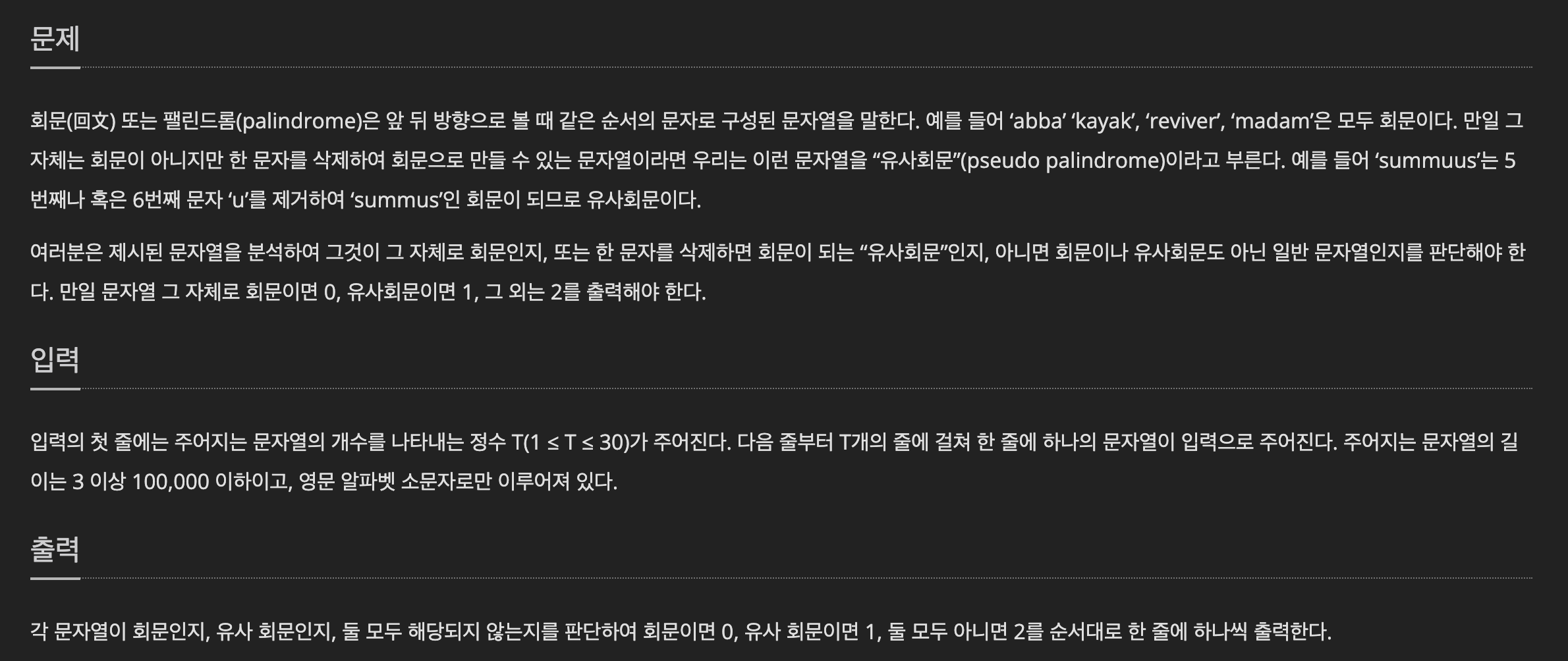 밀린 문제이다. 일반적인 회문은 원래 문자와 뒤집은 문자가 같은 것을 의미하지만, 해당 문제에서는 유사 회문이라는 개념을 제시한다. 유사회문이란 원래 회문은 아니지만 문자를 단 한개를 지웠을 때 회문이 되는 문자를 의미한다. 이 문제에서는 어떤 문자가 회문인지, 유사회문인지, 그것도 아닌지 모두 판단해보는 문제이다.
