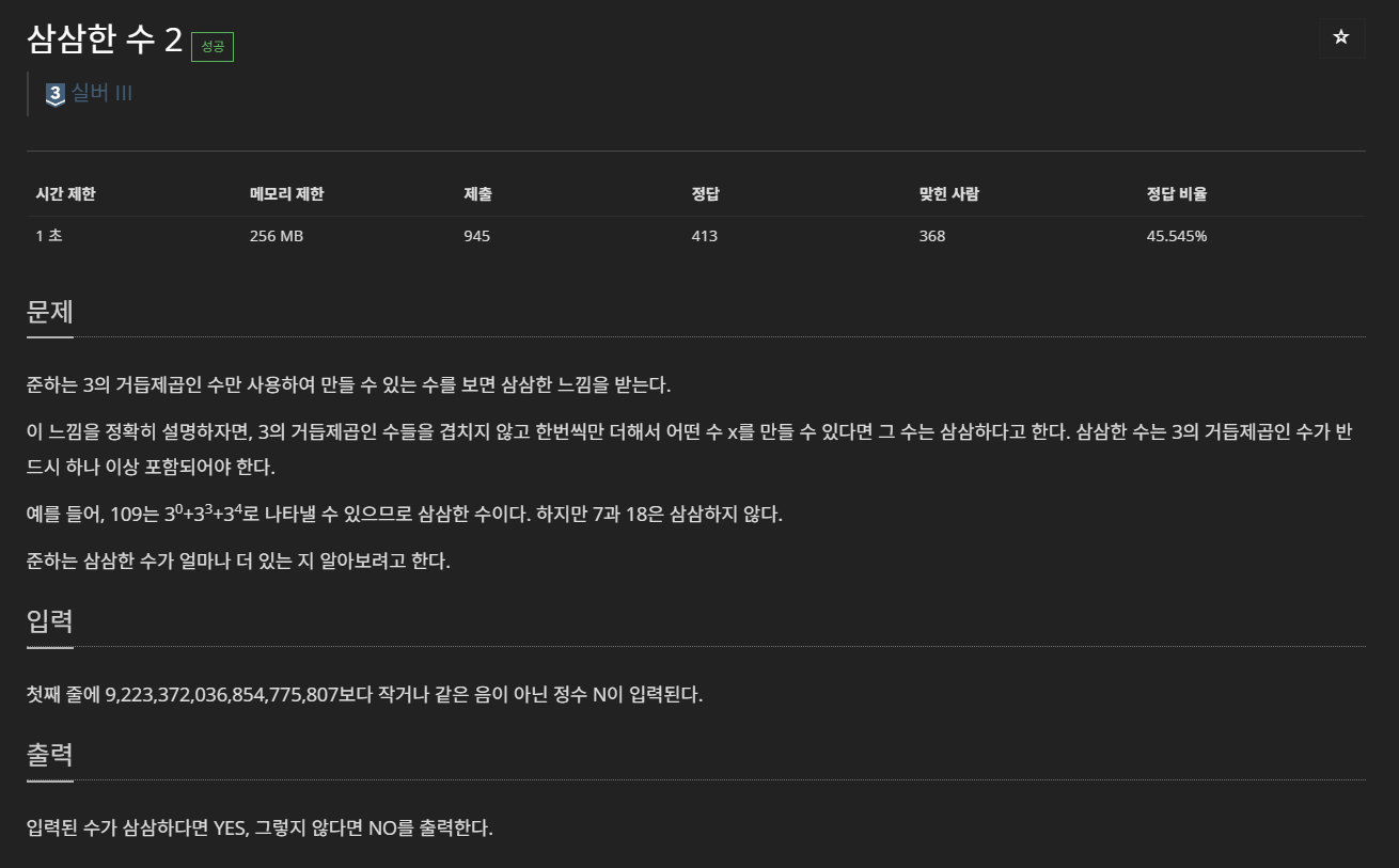 이 문제를 풀 때 간과한 사실은 n에 가장 근접하면서 n이하의 3의 거듭제곱 a를 찾았다면, 해당 함수에서는 더이상 지수를 줄여가며 찾을 필요가 없다. 만약 n - a를 했을 때 삼삼한 수가 아니었다면, n - a/3의 값에서 다시 재귀해야하는데, a/3 이하의 3의 거듭제곱으로는 n - a/3을 만들 수 없기 때문이다. 이를 간과하고 코드를 작성하다가, 직접 만든 극한 케이스인 6078832729528464401을 넣어봤더니 TLE가 나왔다. 해당 숫자는 초항이 1이고 공비가 3인 등비수열의 40번째 항까지 모두 더한 값에 1을 더한 값이다. 3으로 절대 나누어 떨어지지 않는 수이다. 3^40 > 2^63 > 3^39이기 때문에 이를 간과한다면 최대 39!번의 연산을 해야하니 당연히 TLE가 나게 된다. 삼삼한 수 1(17252)에서는 해당 부분을 신경쓰지 않아도 된다.
