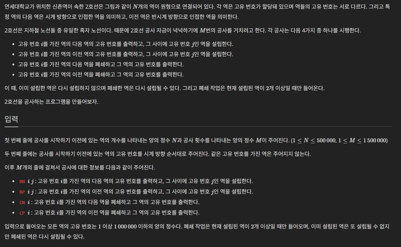 중앙에서 삭제와 삽입이 빈번하고, 앞 뒤가 이어져 있으며, 하나의 역에서 이전 원소와 다음 원소를 모두 알고 있어야 한다. 이중 원형 연결리스트 문제이다. 하지만 STL의 list를 곧이 곧대로 사용했다가는 TLE가 날 것만 같은 N과 M의 최댓값이다. 그래서 메모리의 손해를 좀 보고, 이차원 배열에 이중 원형 연결리스트의 개념을 접목시켰다. 모든 역에는 고유번호가 붙기 때문에 이 고유번호를 배열의 인덱스로 잡고, 해당 배열에는 각각 이전 역의 고유번호와 다음 역의 고유 번호를 저장하도록 한다. 고유번호는 100만까지 있고, 각 역은 두개의 고유번호를 저장해야하기에 메모리가 초과될거 같지만, 2백만개의 int형 정수는 8MB밖에 되지 않는다.