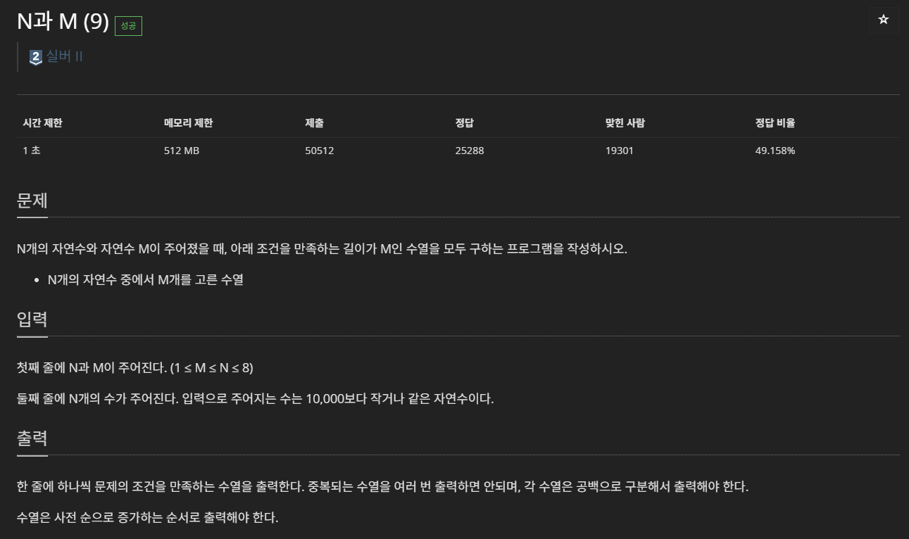 이번 N과 M은 원소를 조합으로 뽑는 문제이다. 언제나 그렇듯 사전 기준 오름차순 출력이기 때문에 입력받은 N개의 원소를 정렬한 후, 백트래킹으로 M개의 숫자를 중복없이(같은 인덱스의 원소를 뽑지 않고) 뽑는다. 이때 N개의 원소에는 중복되는 원소가 존재할 수 있다. 이를 모두 고르게 되면 중복되는 수열이 등장하게 된다. 이를 방지하기 위해 map에 출력한 output과 해당 값이 출력되었는지 기록하여, 중복된 수열이 나오더라도 출력은 한번만 되도록 했다.