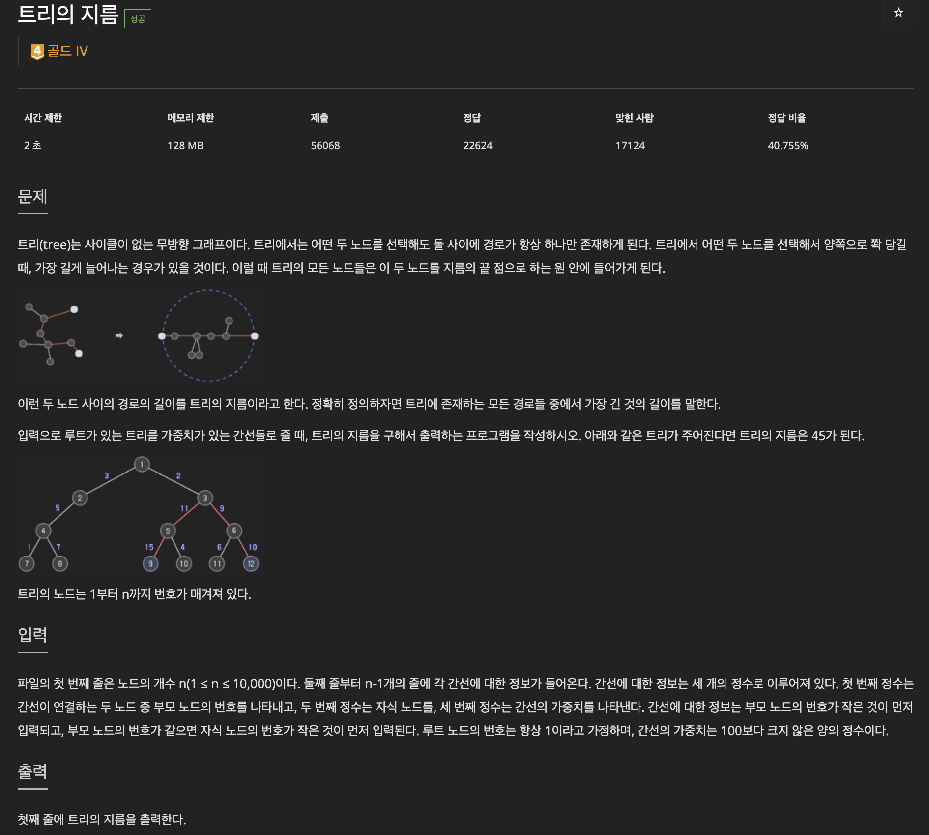 이 문제를 풀던 도중 쏟아져내리는 MLE에 정신을 못차리고 트리의 지름 문제를 백준에 검색했다가 나온 문제이다. 1167번에 비해 n이 10배 적고, 입력도 매우 착한 문제라고 할 수 있다. 풀이는 위의 1167번을 참조하자. 입력부분을 제외하면 같은 코드이다.
