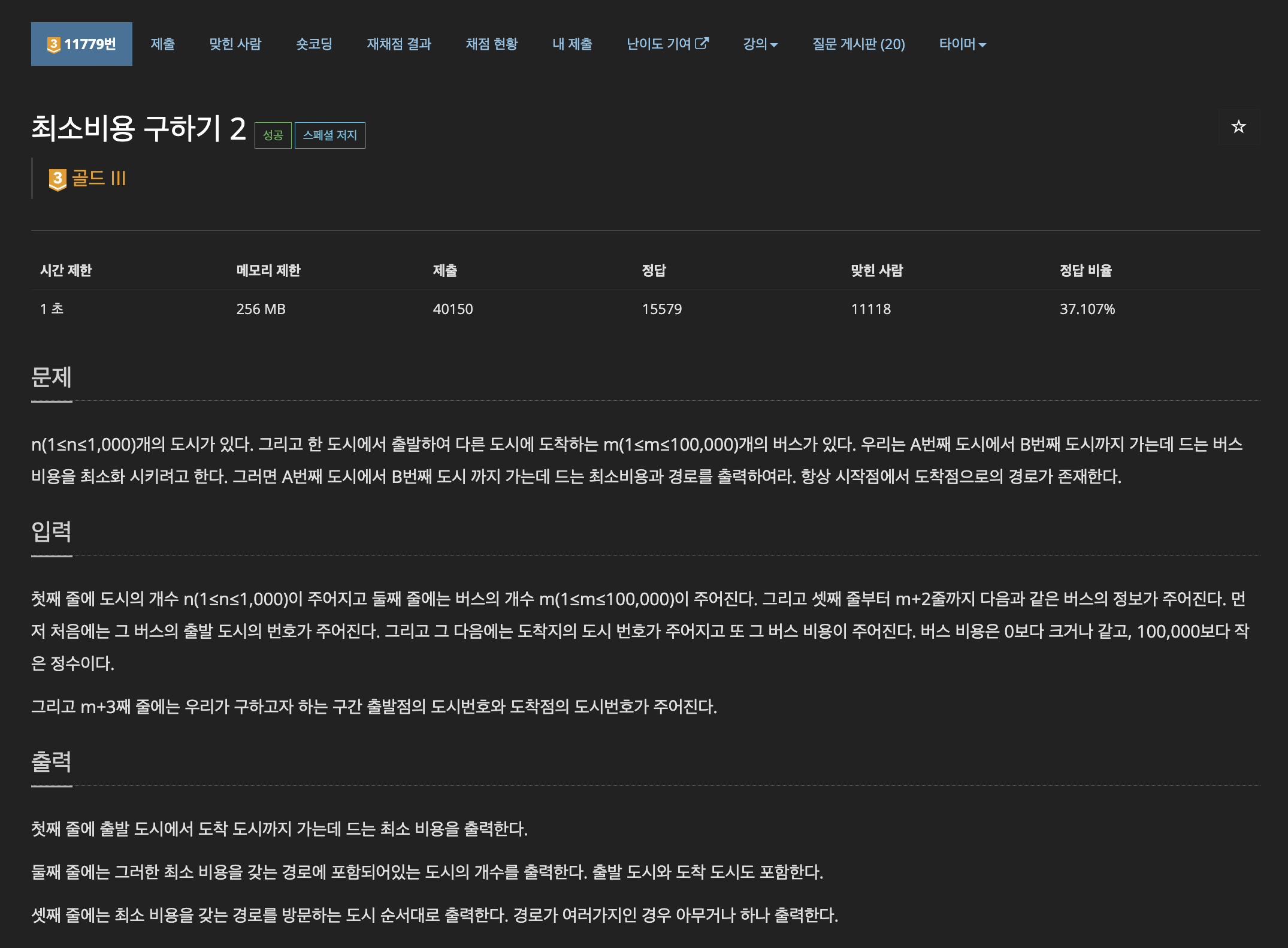 이번 문제는 최단경로 문제이면서, 동시에 최단경로도 찾아야 하는 문제이다. 정점의 개수가 1천개밖에 되지 않기 때문에 플로이드 워셜, 다익스트라 모두 가능한 문제일 것이다. 아직 플로이드 워셜 최단경로 역추적을 공부하지 않아, 다익스트라 역추적을 이용해 풀어보았다. 조만간 플로이드 워셜 역추적도 공부해서 풀어보도록 하겠다.