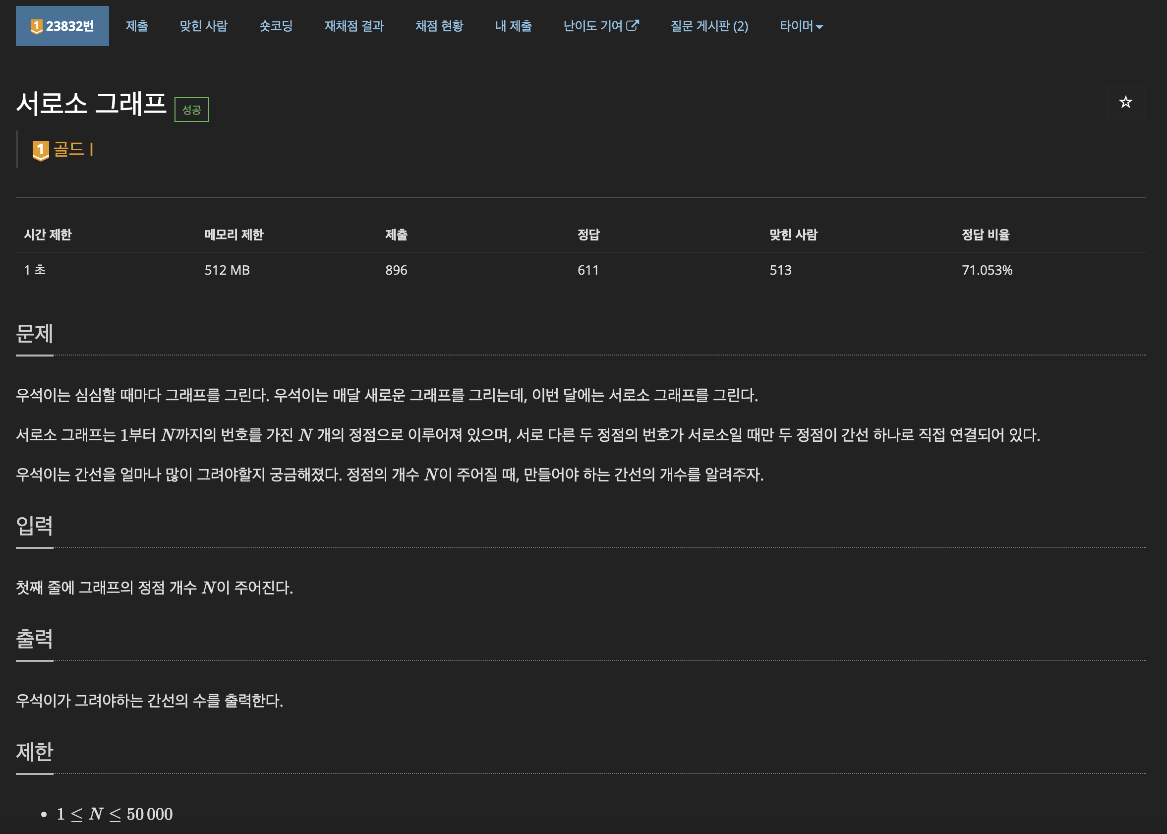 이 문제는 1~N번 정점을 그래프로 만들 것이다. 이때 정점간에 간선을 만드는 조건은 정점 a, b가 각각 서로소여야 한다. 이때 간선의 개수를 구하는 문제이다. 나는 처음에 이게 오일러 피함수 문제인지 헷갈렸다. 서로소의 개수와 연관되이었다보니 오일러 피함수가 가능할 것 같다 생객해보다가 풀이를 떠올렸다. 문제가 조금 말이 어려워서 그렇지 조금 차근차근 풀어나가보자.