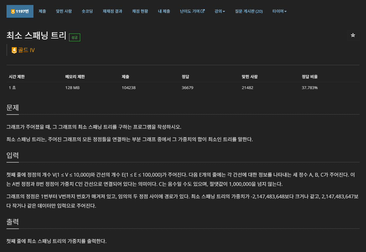 문제 이름이 정답인 문제다. 최소 스패닝 트리(Minimum Spanning Tree, MST), 최소 신장 트리라고 하는 이 문제는 임의의 그래프가 주어졌을 때, 모든 정점을 최소한의 비용으로 모두 연결하는 알고리즘이다. MST를 구하는 알고리즘은 세가지가 있다. 프림, 솔린, 크루스칼 알고리즘이 있는데, 나는 유니온파인드 자료구조도 같이 공부할 겸 크루스칼을 공부한 상태이다. 크루스칼 알고리즘은 나중에 언젠가 정리하겠지만, 간단하게 설명하면 모든 정점을 유니온파인드 자료구조에서 루트노드인 상태, 그러니까 미연결상태로 둔 뒤, 간선의 가중치를 오름차순으로 정렬한다. 간선 정보들을 선형탐색하면서, 두 정점이 같은 집합이 아니라면 연결하고, 이미 같은 집합에 있다면 무시하는 방식으로 모든 정점을 연결한다.