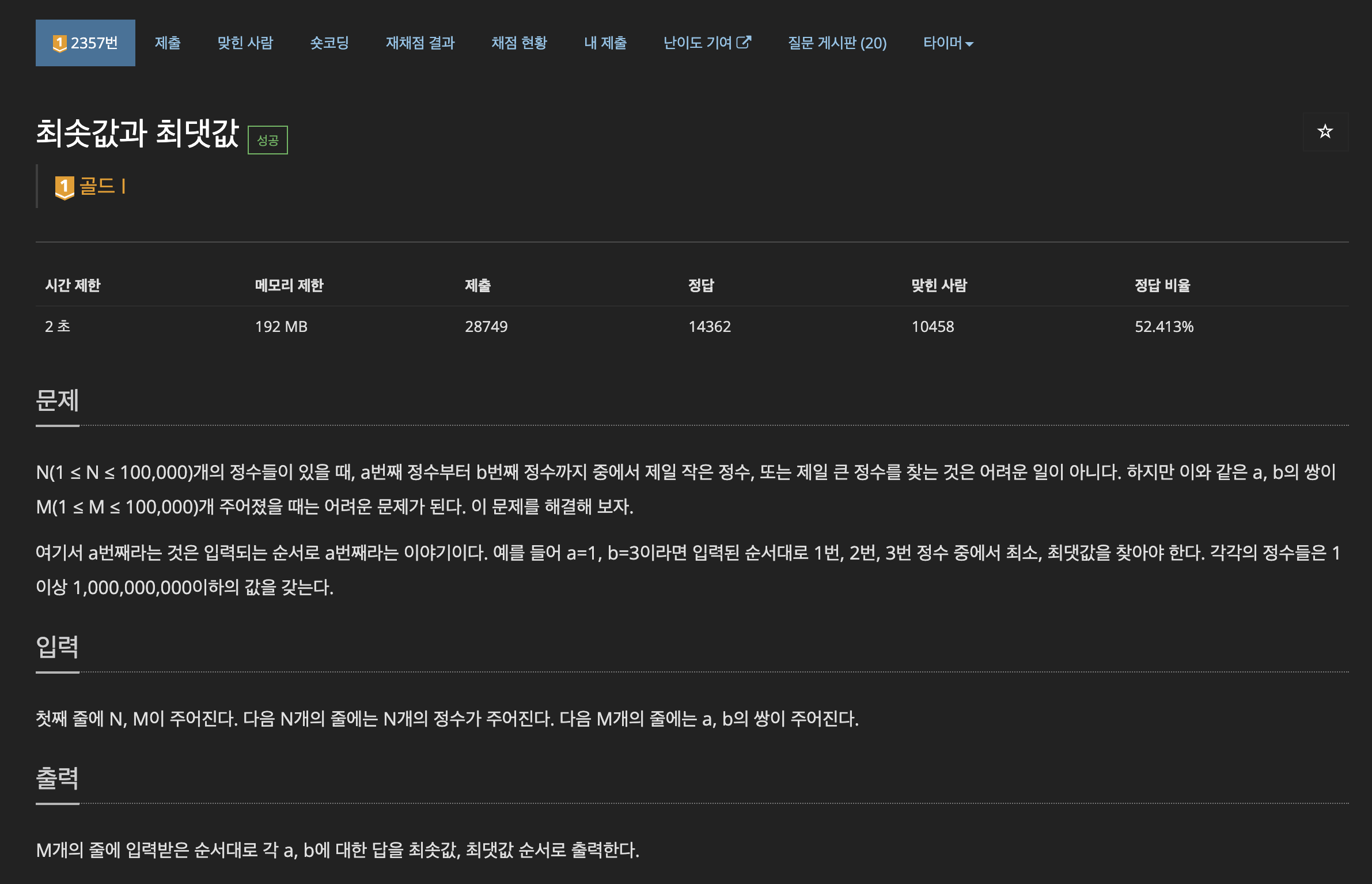 해당 문제는 배열을 업데이트하는 쿼리는 존재하지 않지만, 배열의 구간에 대해 반복적인 답을 요구하기 때문에, 세그먼트 트리를 적용하면 편하게 풀 수 있다.