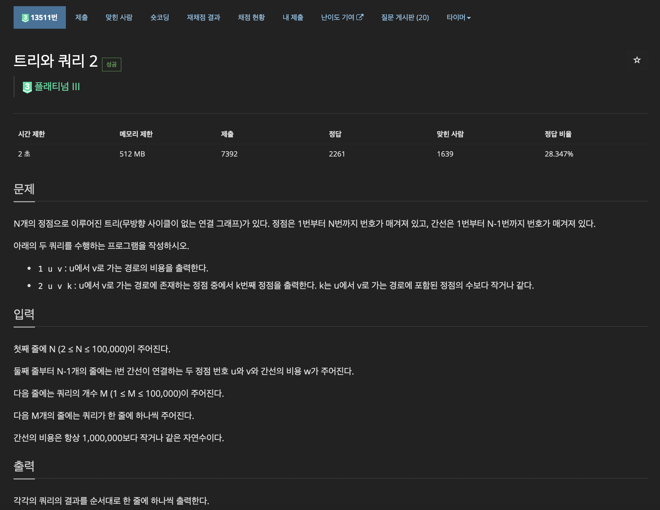 2번 쿼리는 u → v의 경로상에서 k번째의 정점을 출력하는 것이다. 이때, 예제입력을 보면 알겠지만, k는 1부터 시작한다. u → v로 가기 위한 정점이 u → a1 → a2 → a3 → ... → LCA → b1 → b2 → b3 → ... → v라고 하고, 정점의 개수가 p개라고 하면, k = 1일땐 u, k = p일땐 v이다. k번째 정점은 a 구간에 있거나(u → LCA), b 구간에 있을 것이다. LCA일수도 있다. 그래서 u → LCA의 정점 개수와 v → LCA의 정점의 개수를 구하고, 경우를 나누어 구해주면 된다.