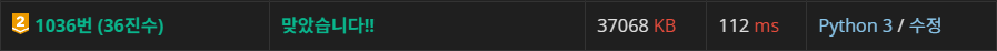 아무래도 36진수 숫자의 길이가 최대 50이기 때문에, 입력으로 들어올 수 있는 36진수의 최댓값을 10진수로 변환하면 36^50 - 1이다. 이 값이 얼마인진 중요하지 않지만, 해당 값은 10진수 78자리정도의 숫자이며, gcc에서 지원하는 __uint_128이라는 최대 2^128-1까지 저장할수 있는 이 숫자도 38자리의 숫자를 저장할 수 있다. 그래서 난 과감히 파이썬을 사용하기로 했다. 원래는 C++로 풀지만... 큰 수 사칙연산 구현이 너무 귀찮다. 그래서 평소에는 거의 C++만 사용하지만, 큰 수와 같이 파이썬을 사용하는것이 더 편하다고 생각이 들때는 파이썬을 바로 사용하는 편이다. 파이썬은 숫자의 제한이 (거의)없기 때문에, 이를 깡그리 무시하고 내가 원하는 정수를 저장할 수 있었기 때문이다.
