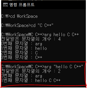 실행파일이 현재 위치한 경로에 있다면 실행파일의 이름은 실행파일을 실행시키는 명령어이다. 이 구문을 통해 실행되면 공백을 기준으로 4개의 문자열이 전달된다.