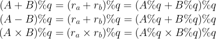 그래서, 각 숫자에 대해 모듈러를 먼저 처리한 후, 원하는 연산을 한 다음에, 또 모듈러를 취해줘도 되는 것이다. 물론 나눗셈에는 적용되지 않는다. 여기서부터는 모듈러 역원이라는 개념이 적용된다.