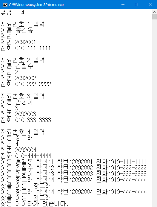 학생 정보를 저장하는 구조체를 만들고, 구조체를 입출력하는 함수와 학생을 찾아서 출력하는 main함수를 완성하시오.