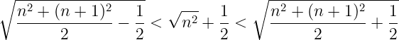 인접한 제곱수 a, b가 있다고 하자 (a < b, ex. a=4, b=9). a와 b는 동시에 홀수나 짝수가 될 수 없다. 따라서 a, b의 중앙값은 ~.5가 나오게 된다. 따라서 중앙값에 가장 인접한 두 자연수는 중앙값의 ±0.5의 값을 갖는다. 이 두 수의 제곱근 값을 살펴보자. a와 b는 같은 n값에 대해 각각 n^2, (n+1)^2로 나타낼 수 있다. 이제 다음을 증명하면 된다.