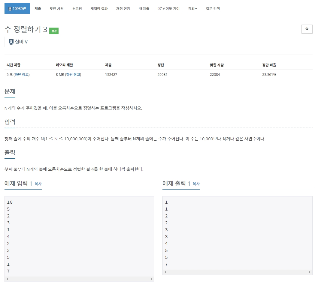10989번: 수 정렬하기 3