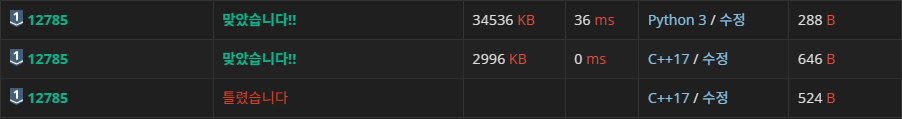 그중에서 두번째 풀이를 사용했다. 당시에는 완전무결하게 동작하는 줄 알았고, 이 문제를 시도했을때도 그렇게 풀이했다. 하지만 계속해서 틀렸고, 왜 틀렸는지 알지 못해 넘긴 문제였다. 아래는 내가 실패한 코드이다.