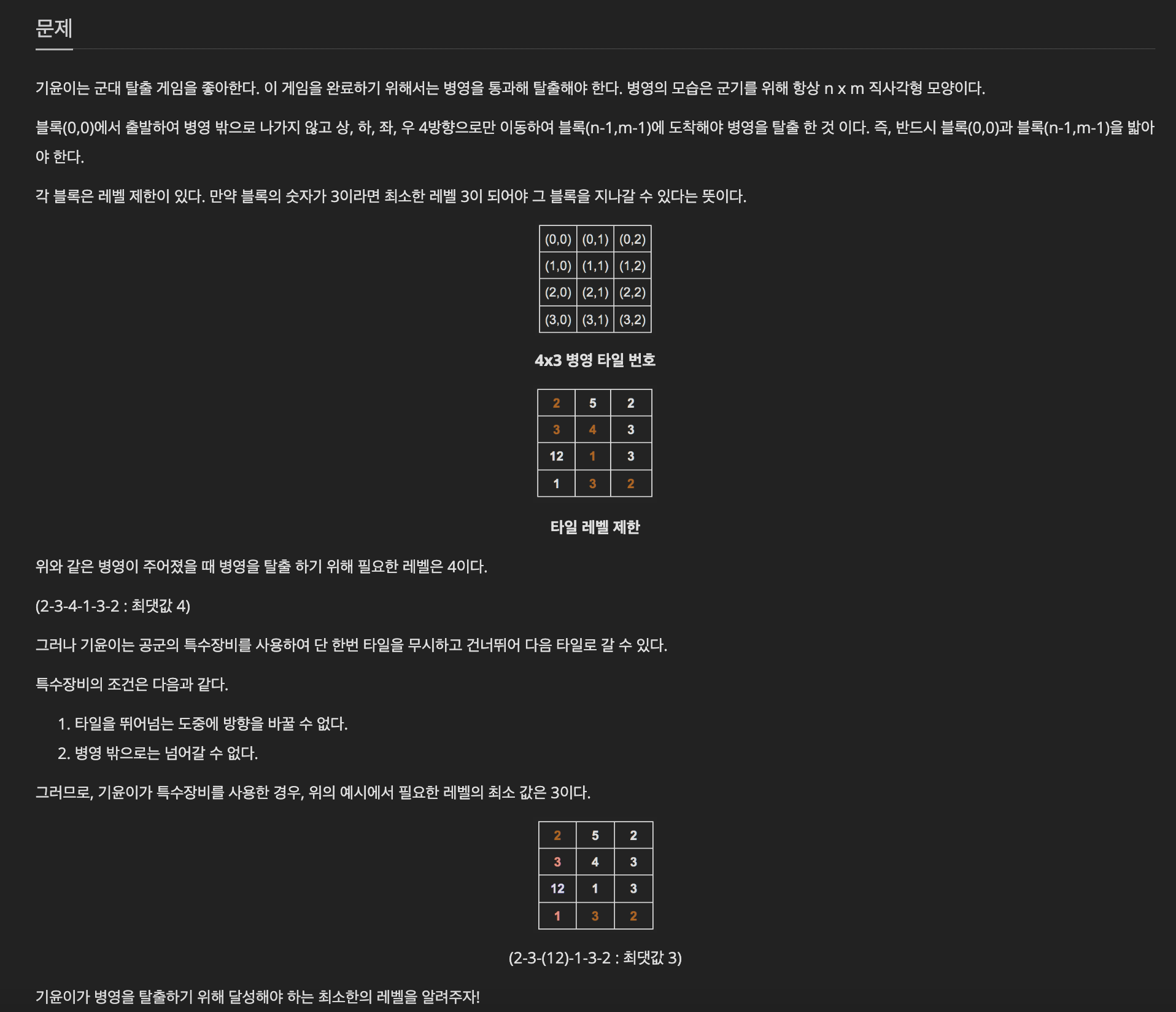 벽부수고 넘어가기 문제와 저번 1939번 문제를 섞어둔듯한 문제이다. 1939번에서 사용한 그래프탐색+이분탐색과 벽부수기 풀이를 섞어서 시도했지만, 진짜 계속해서 틀렸고, 어디서 틀렸는지 감도 잡히지 않았다. 결국 다른 분의 풀이를 아주 조금 참조했다. visited 배열을 2차원이 아닌 3차원으로 처리하는 테크닉을 보고, 아 이런 테크닉이 있었지 하고 코드를 개선했다.