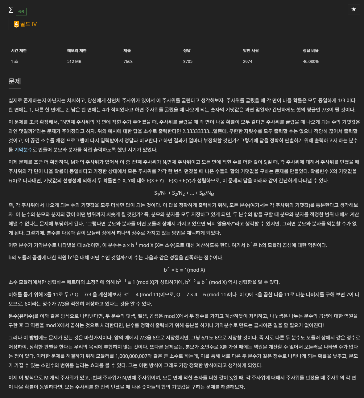 문제가 이렇게 긴건 오랜만에 보는 것 같다. 결국은 모든 주사위를 한번씩 던졌을 때의 눈의 합의 평균을 나머지가 1000000007인 모듈러 역원을 통해 나타내라는 것이다. 모듈러 역원을 나타내는 방법은 여러가지가 있다. 문제에서는 소수 모듈러일때 가능한 페르마 소정리를 소개하고 있다.