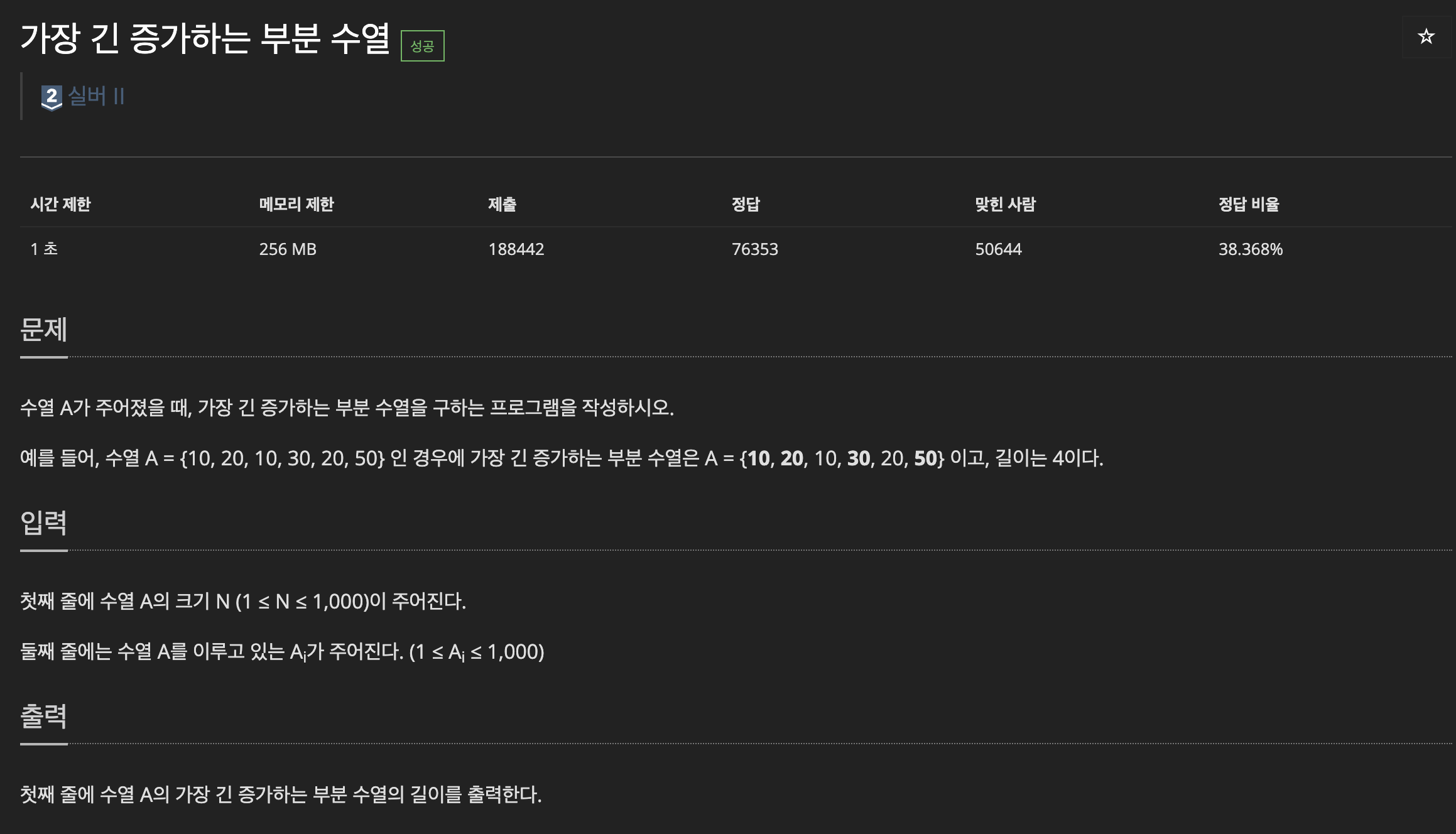 간단히 설명하자면 dp로 생각했을 때 S의 0번째 원소부터 i번째 원소까지 살펴봤을 때의 lis를 계속해서 찾아보는 것이다. 물론 i를 증가시킴에 따라 0 ~ i-1번째 원소를 살펴보는 것은 O(N^2)의 시간복잡도가 걸릴테고, 나중에 응용하는 문제가 나오면 반드시 터질 것이다. 그러니 우리는 더 빠르게 개선해야한다. 물론 이 문제에서는 N이 1000밖에 안되기 때문에 상관은 없지만, 나중을 위해 개선된 방식을 공부하자. lis라는 배열을 하나 만든 후, 해당 배열에 lis를 계속해서 저장한다. 정확히는 lis가 아닌 lis가 될 수 있는 후보들을 저장하는 배열이다. 해당 배열에 오름차순으로 후보들을 저장하고, 이분탐색을 통해 계속해서 갱신한다. 이렇게만 말하니 이해가 잘 안 될 것이다. 그러니 내가 알고리즘을 정리하기전까진, 다른 분들 설명 같이 보는게 좋을 것 같다.