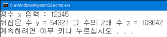 정수 x를 입력 받고 그 수를 뒤집은 수 y를 구하고 z는 y의 2배수(y*2)를 구해서 다음 화면과 같이 출력하는 프로그램을 작성하시오.
