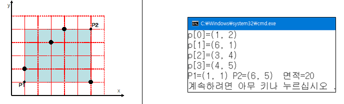 프로그램에서처럼 구조체를 선언하여 N개의 점들의 좌표가 주어졌다. 그 점들을 둘러싸는 최소 크기의 사각형의 두 점 좌표 P1, P2를 구하고 사각형의 면적을 구하는 프로그램을 완성하시오.