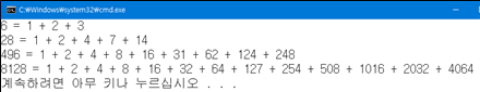 완전수란 어떤 정수의 약수를 모두 더했을 때 자기 자신과 같은 수를 말한다. 예를 들어 6의 약수 1, 2, 3을 더하면 6으로 정수 자신이 되는 수이다. 다음 화면과 같이 2 ~ 10,000 사이의 수 중에서 완전수를 구해서 출력하는 프로그램을 작성하시오.